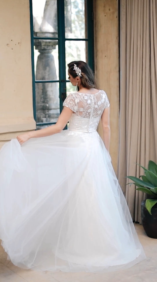 This detachable wedding dress top is an enchanting addition to any wedding dress. Constructed from a floral lace featuring a high scoop neckline and paneled princess line panels for close body fit. This versatile wedding dress top features cap sleeves for those who wish to have a little coverage. The back features button and loop closures for a delicate and classic finish.