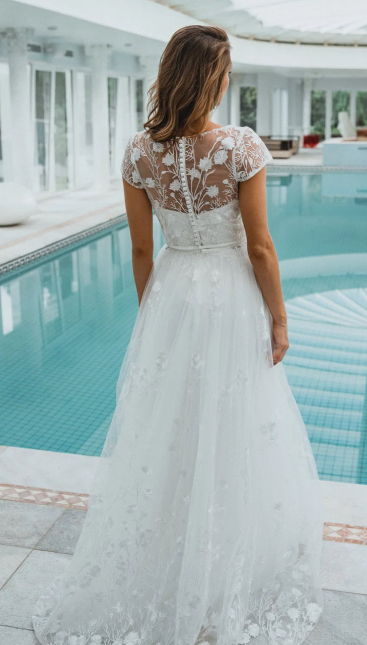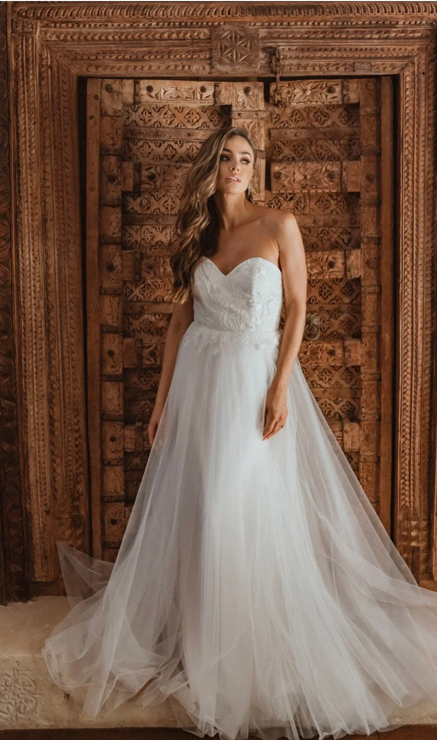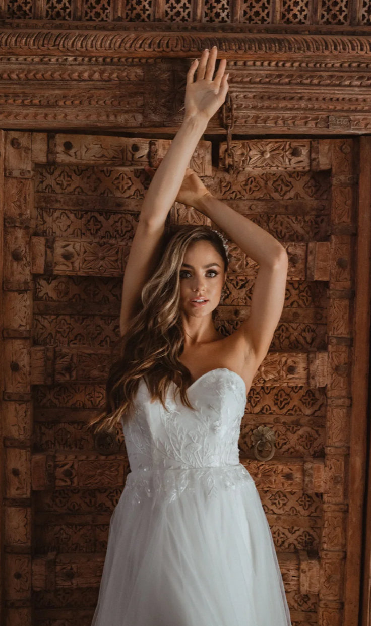 This wedding dress is a chic and romantic gown perfect for the modern bride who still wants traditional elements. The Josée features a strapless structured sweetheart neckline bodice constructed from a embroidered floral lace which flows onto the waistline and slightly onto the skirt. The floor length A-line silhouette skirt is crafted with a soft tulle fabric which is lightweight and perfect for any season. Whether you’re walking down the aisle at a breezy beach ceremony, or a chic inner city affair, the Haines would be the perfect choice.