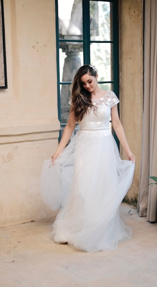 Cette robe de mariée est une robe chic et romantique parfaite pour la mariée moderne qui souhaite toujours avoir des éléments traditionnels. La Josée présente un corsage à décolleté en cœur structuré sans bretelle construit à partir d'une dentelle florale brodée qui coule sur la taille et légèrement sur la jupe. La jupe trapèze longueur au sol est confectionnée dans un tissu en tulle doux, léger et parfait pour toutes les saisons. Que vous vous promeniez dans l'allée lors d'une cérémonie de plage venteuse ou d'une affaire chic au centre-ville, la Josée serait le choix parfait.