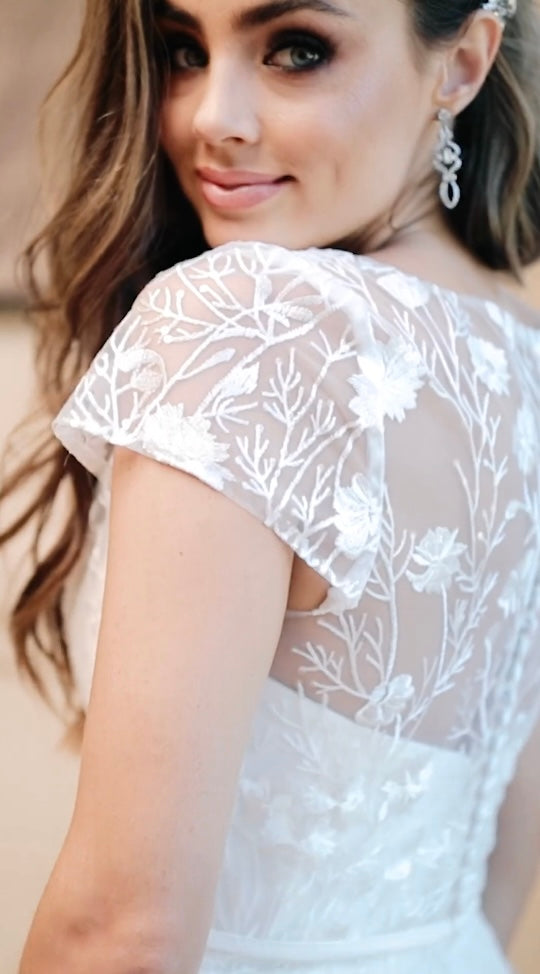 Ce haut de robe de mariée amovible est un ajout enchanteur à toute robe de mariée. Fabriqué à partir d'une dentelle florale avec une encolure dégagée haute et des panneaux de ligne princesse à empiècements pour un ajustement près du corps. Ce haut de robe de mariée polyvalent comporte des mancherons pour ceux qui souhaitent avoir un peu de couverture. Le dos comporte des fermetures à boutons et à boucles pour une finition délicate et classique.