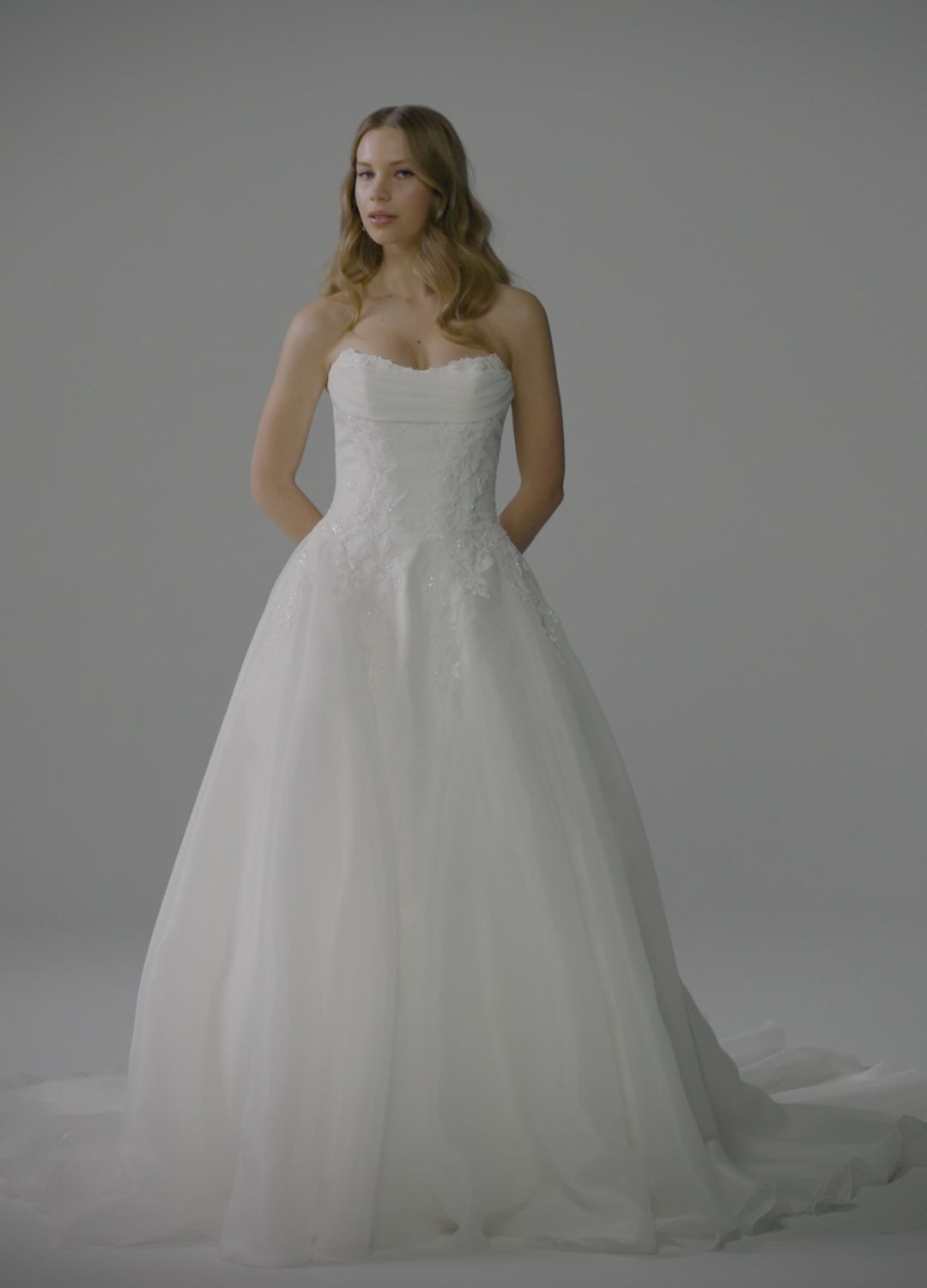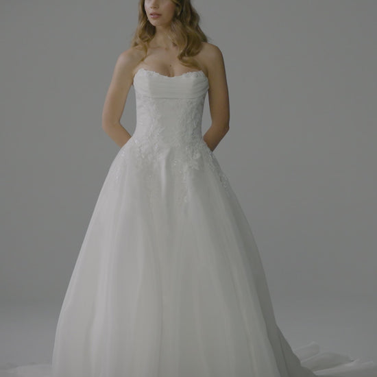Say 'I do' in our strapless ball gown, Juliane! This sleek, princess ball gown promises to bring your regal wedding dreams to life, crafted from luxurious organza. She represents all things modern, with her sexy, scoop neckline and bodice that features floral lace placed to contour the body. Her bodice is adorned with a distinctive toucha panel of ruched organza set just below the neckline. Thought Joy couldn't get any better? She features hidden pockets to hold your bridal essentials on your wedding day!